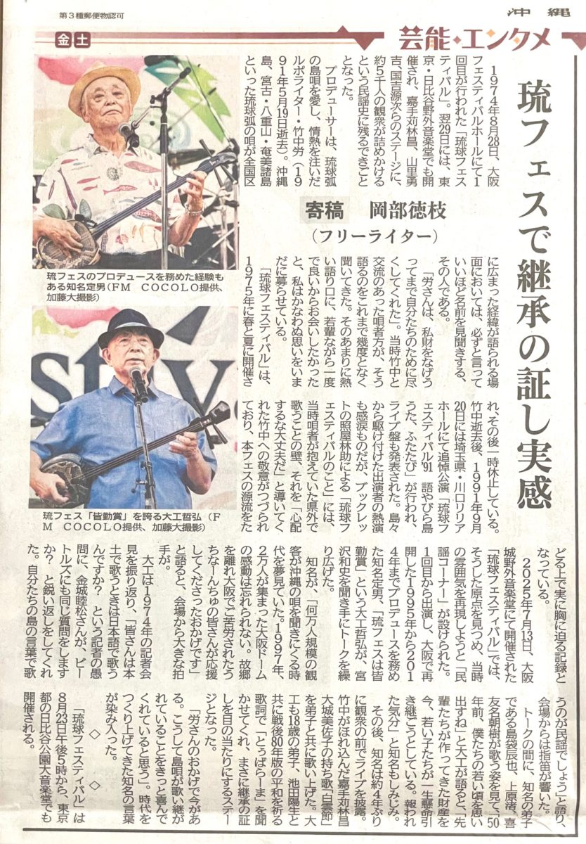7月16日、大阪野外音楽堂で開催された「琉球フェスティバル」について、8月9日付「沖縄タイムス」に寄稿しました。